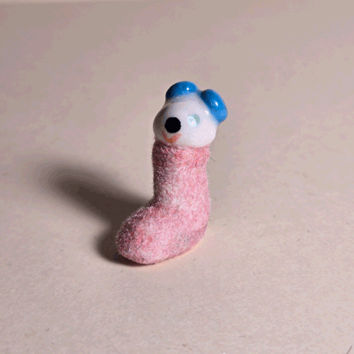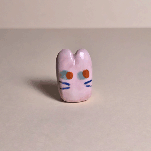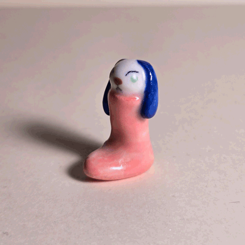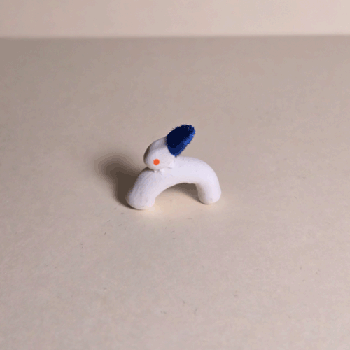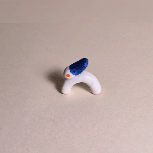 Fuzzy Blue Booty-Pet: Pink & White Bunnysemi-glazed, blue flocked porcelain